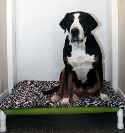 One our our AKC Champion Greater Swiss Mountain Dogs, Dolly, getting comfy in a suite.